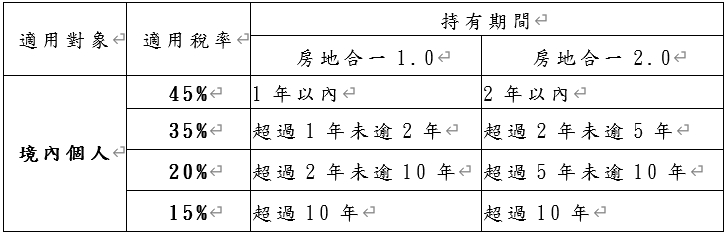 由圖表可知,房地合一1.0版僅針對持有「1年內」出售房地的案件課徵45%重稅,升級2.0版後,時間拉長至持有「2年內」出售房地均被課徵45%重稅。