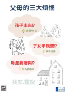 觸龍說趙太后,父母之愛子,則為之計深遠。從古至今母親總是為了兒女事煩憂,對父母來說,含辛茹苦扶養孩子長大,多少會希望將來可以有孩子倚靠,能安享晚年,可面對茫茫未來,母親和孩子一樣充滿不確定感,在現代超高齡化的社會中,孩子生得少,父母對個別孩子的投入比以前大上許多。對母親而言,一方面希望孩子可以多陪伴自己、多少給自己一些孝親費用以表心意;另一方面也希望孩子可以有穩定的生活、可以自己照顧好自己。但隨著現代的經濟社會改變,現代年輕人所面對的世界,選擇太多機會卻太少,甚至有人稱,這是一個努力也不會有回報的時代。這個時候父母不僅擔心,孩子是否可以在自己身後照顧好自己,未來孩子的教育和照顧怎麼辦,是否在法律上能好好繼承自己的遺產。這些問題在高齡化、晚婚、晚生子的現代社會中,父母的憂心日漸加重,一邊擔心著孩子的未來,也煩惱者自己的將來。以下就由律師向您說明,關於現代母親的煩惱,您不能不知道的幾件事。
