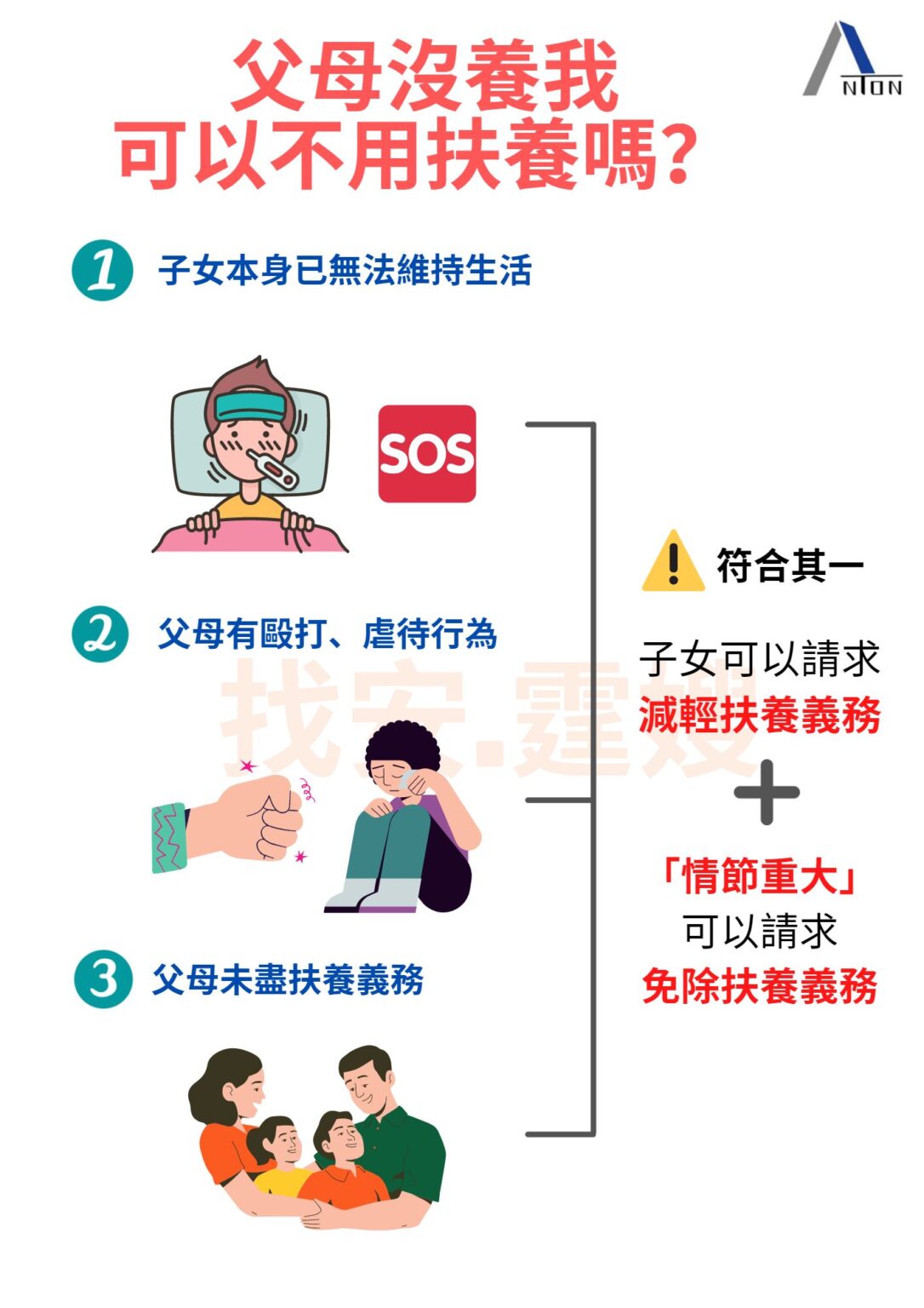 如前所述,依據《民法》第1114條及第1115條規定,親屬間互負扶養之義務,而負扶養義務者有數人時,直系血親卑親屬是第一順位的義務人。父母與子女之間就是直系血親的親屬,父母固然應扶養年幼的子女,子女長大後對父母也有扶養的義務,責無旁貸,但相對應的,有些父母親可能早年有不良行為(例如:從未扶養過孩子、毆打孩子等),只要符合以下其中一個要件,若由子女負擔扶養義務顯失公平,子女有權利請求減輕扶養義務,當以下要件符合「情節重大」時則可以請求免除扶養義務。