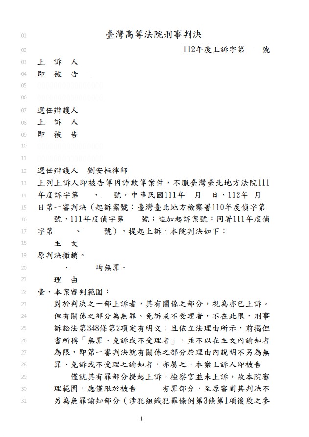 惟案經上訴高等法院,律師透過主張當事人於犯罪行為主觀上的不具備,並提及相關有力證據,成功讓法院認同本案當事人,是出於住院期間受詐騙集團誘騙,誤以為該集團經營法博奕事業,故而協助幫忙匯款、轉帳等事項。縱然行為的確造成受害民眾的財物損失,但仍難以認定有詐欺及洗錢的故意,並就此撤銷原一審判決,改以無罪論定。
