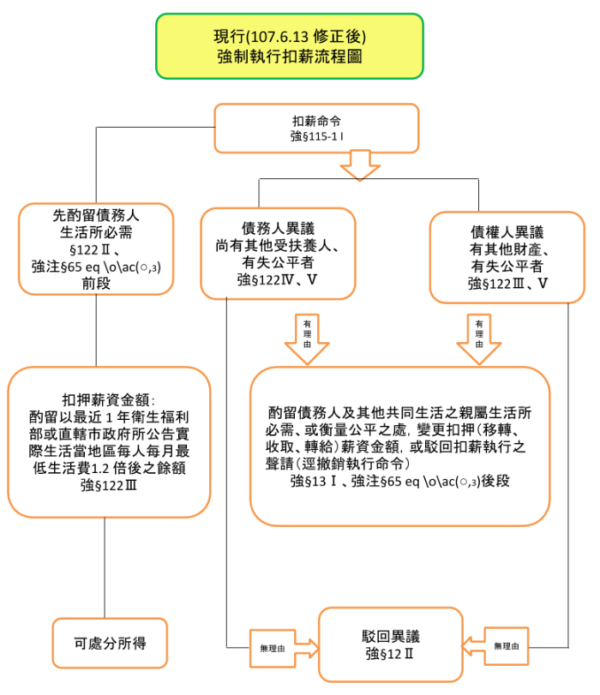 以下附表為強制執行扣薪流程圖,供讀者們參考,由於修法前法院強制執行法扣薪多為三分之一,如身邊朋友或親人在修法前已持續被扣薪三分之一至今,可以依照上述撞超跑孝子的例子來計算,換句話說,每月薪資不高,扶養人口也不少,則修法後扣薪並非固定三分之一了。因此,如果依修法後規定計算每月扣薪金額少於三分之一,債務人可依據強制執行法第12條規定向執行法院聲明異議,請求撤銷該執行命令,改主張以每月可領每月薪資扣除每月「債務人」與「共同生活親屬」合計之生活費用之餘額作為扣薪金額。筆者常常看到一些弱勢民眾拿著法院扣薪執行命令到處求助 ,卻往往忽略自己得多了解生活周遭重要法律常識,快動筆算一算自己可以扣除多少生活費和扶養費,千萬別讓自己的權益睡著了!