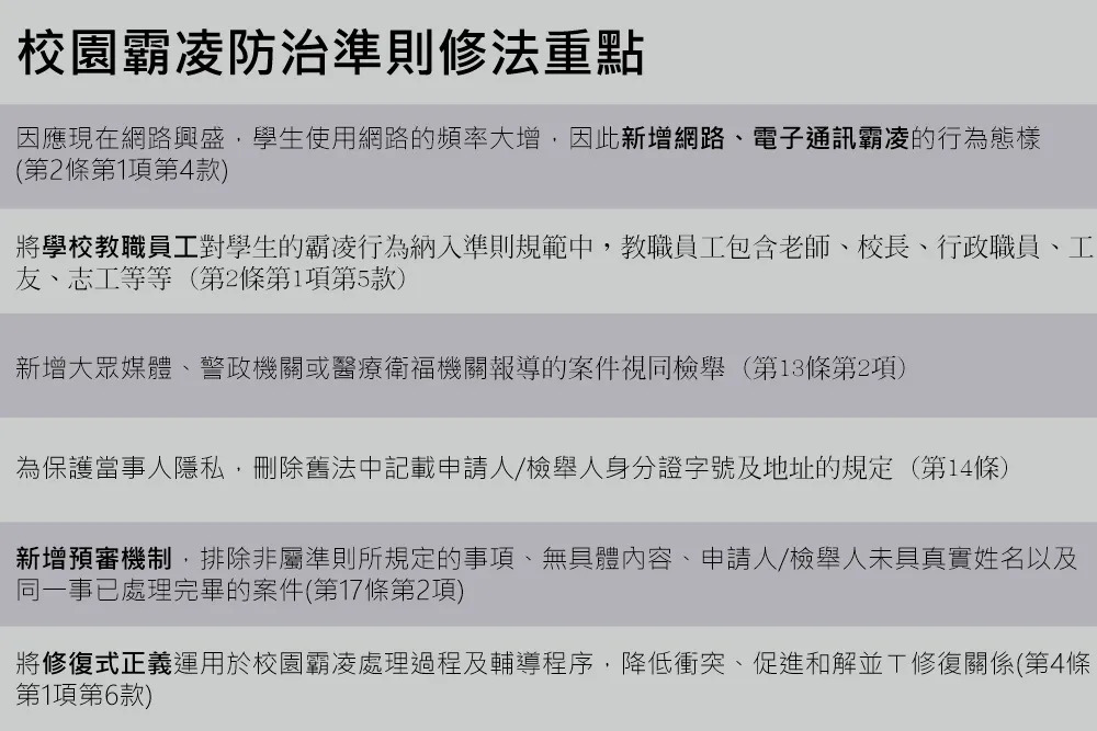 新修正校園霸凌準則的另一大重點,便是使校園霸凌防制政策能夠妥善落實到每一個校園中,並且提高行政效率以及事件處理的完善度,為了達到上述目標,新法中規定各校應明訂校內校園霸凌防制相關規定、增訂了預審機制、更引入了修復式正義的思想,希望能夠降低衝突並促成和解及修復關係。