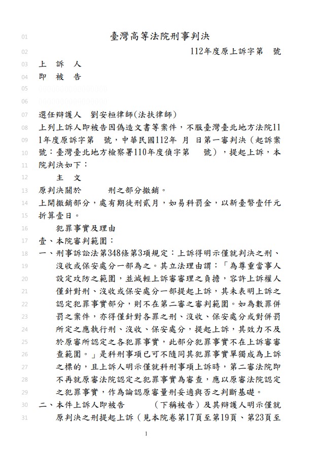 當事人在第一審後找到劉律師幫助,希望由律師協助減輕其刑,並提起上訴,劉律師釐清案件後,認為原審的判決違反比例原則,且當事人所為並不構成累犯,最後憑藉著執業多年的談判技巧,成功說服法官,改判有期徒刑兩個月。