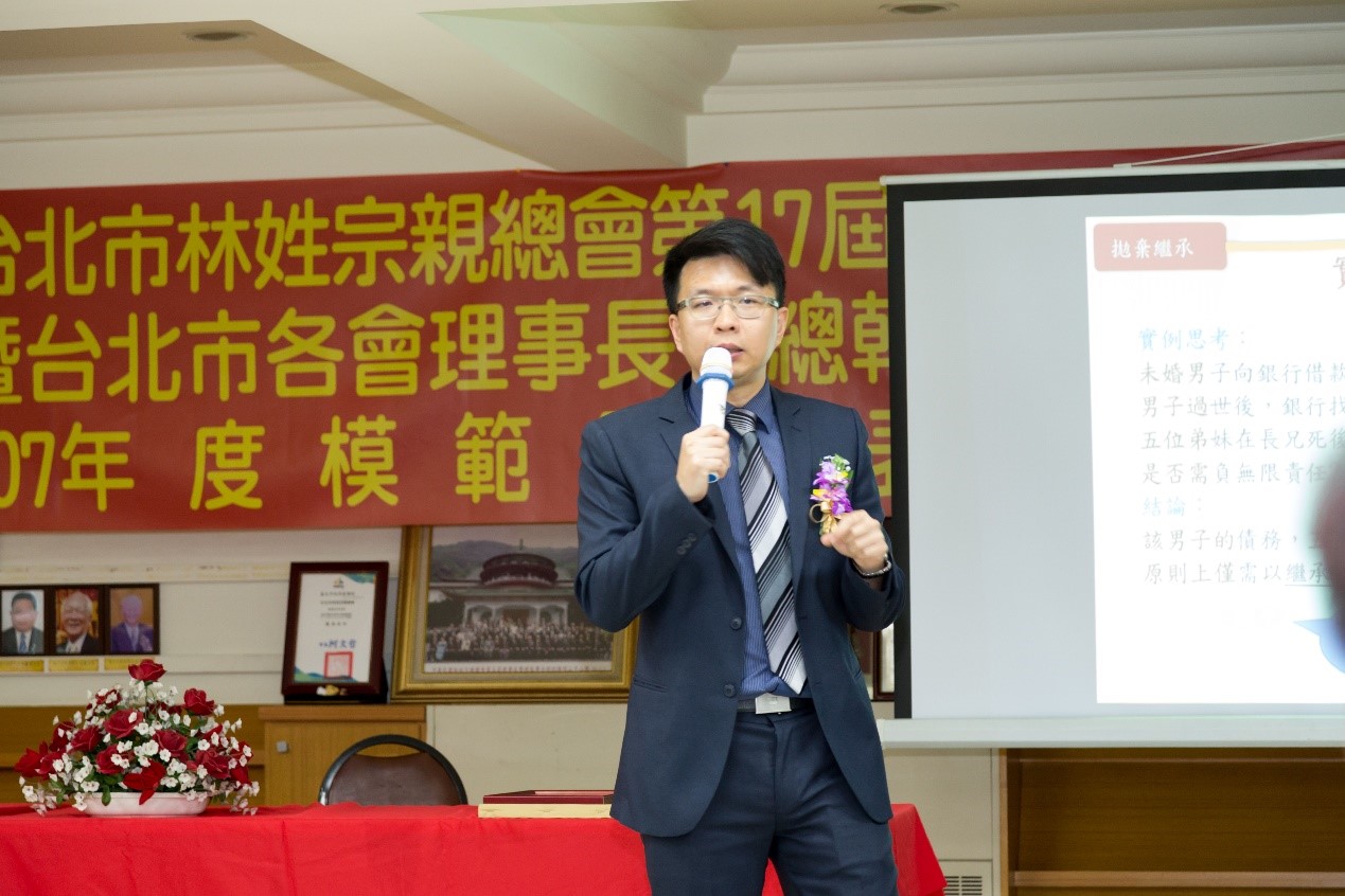 安律師向來對遺產繼承部分有所研究,多年來所內承接了各種大小遺產繼承紛爭案件,因此律師對於相關遺囑、繼承、財產分割的法律問題擁有豐富的處理經驗。台北市林姓宗親會為避免往後子女紛爭,特意邀請安律師參與會內演講,向人丁興旺枝繁葉茂的林姓宗親會會員針對遺囑的做成,財產的保障做法律上的說明。