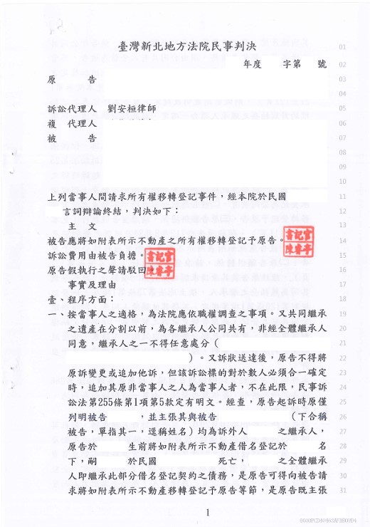 本件涉及當事人借名契約爭議,由於借名人的意外死亡,讓財產的歸屬出現疑義,出名人的繼承人,也因不知記名經過,將父親名下的房屋逕行遺產上分配。所幸借名人在劉律師的幫助下,成功透過房屋稅單及相關繳納憑據與買賣時證人的傳訊,成功讓法院判定返還房屋,維護當事人的財產利益。